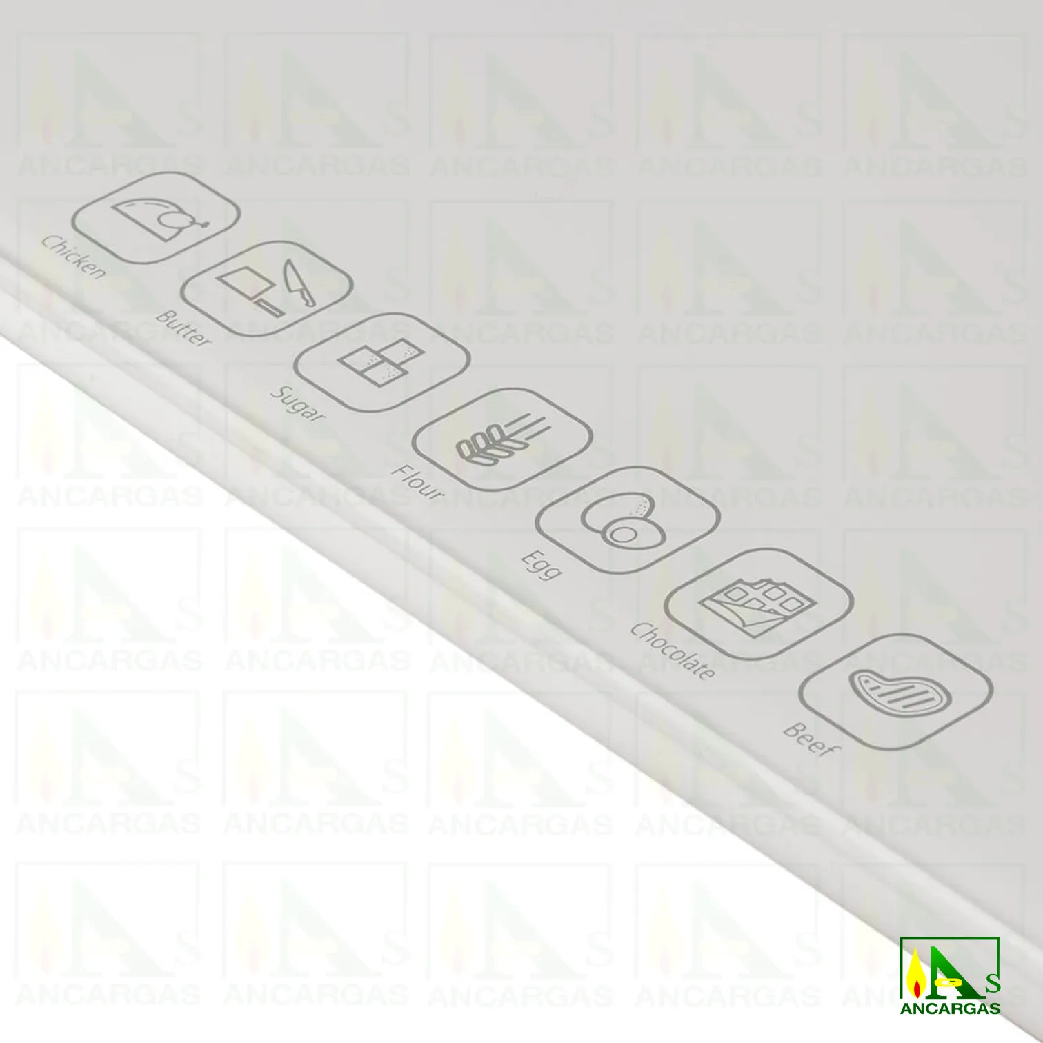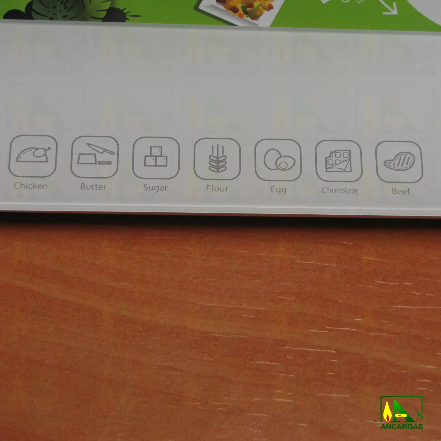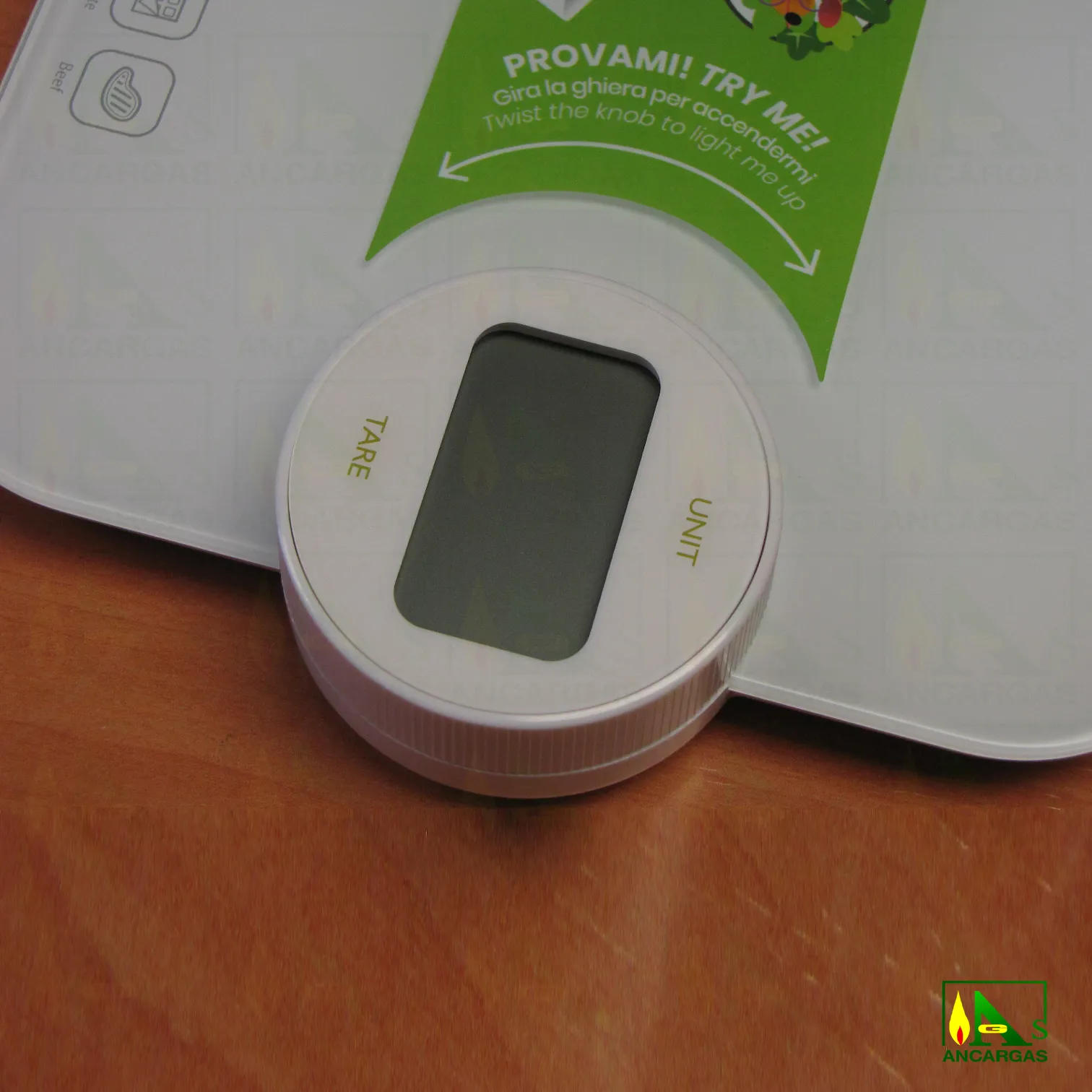 Báscula de cocina digital de cristal templado de alta calidad, elegante, fácil de usar. Innovador funcionamiento SIN BATERÍA, recargable manualmente con un simple giro del mando. El contador de calorías incorporado con botones táctiles le permite calcular y controlar la ingesta de calorías de los 7 alimentos que se pesan con más frecuencia: mantequilla, azúcar, harina, huevos, chocolate, pollo y ternera. Gran pantalla LCD de 4,4 x 2,5 cm y superficie de pesaje grande y fácil de limpiar. Tamaño de escala 25×18,2×3,2 cm. Práctica función de cálculo de tara para pesar cómodamente diferentes ingredientes en un solo recipiente. Graduación: 1 g hasta 5 Kg. Unidades de medida disponibles en g y oz. Medición de volumen de líquido. Fácil de guardar: súper delgado para ahorrar espacio en un cajón. Función de apagado automático. Indicadores de nivel de batería y sobrecarga. Pies antideslizantes.