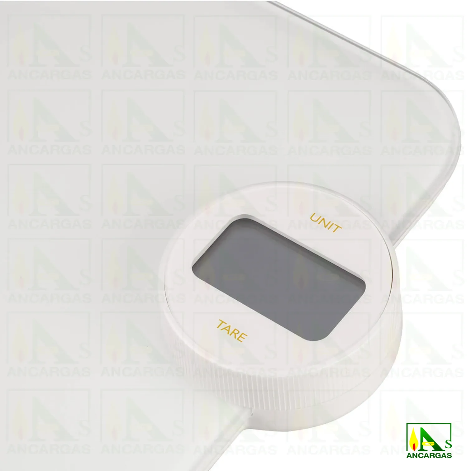 Báscula de cocina digital de cristal ultrafino con función de tara y apagado automático. Tecnología sin batería. Controles táctiles y medición de volumen de agua y leche.