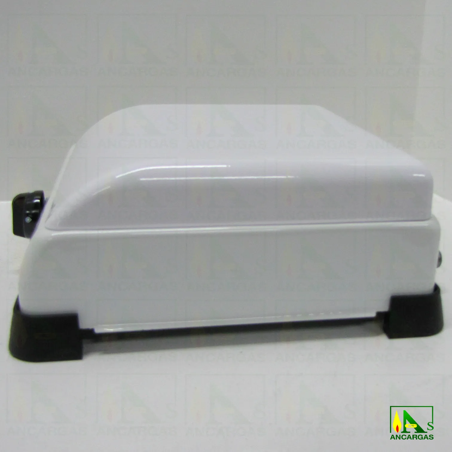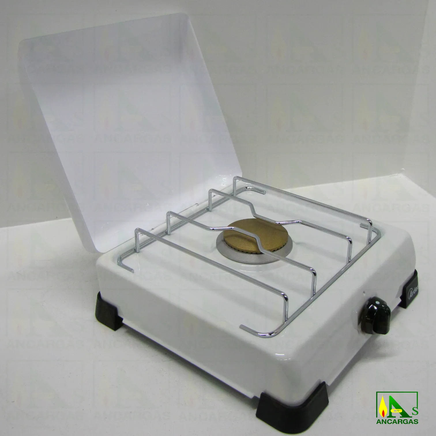 Cocina a gas con 1 quemador, esmaltada, con tapa. Quemado rápido. Para GLP. Parrilla de varilla cromada. Topes de plástico anti-arañazos. Certificado CE y IMQ. Testada 100% en línea de producción. Made in Italy.