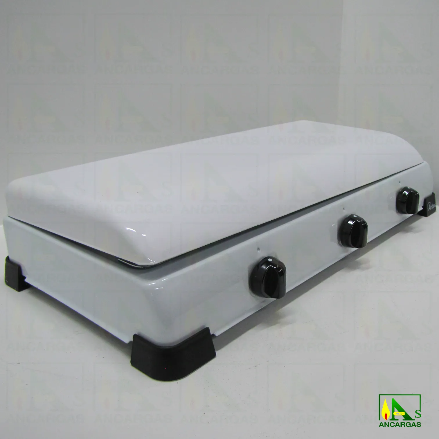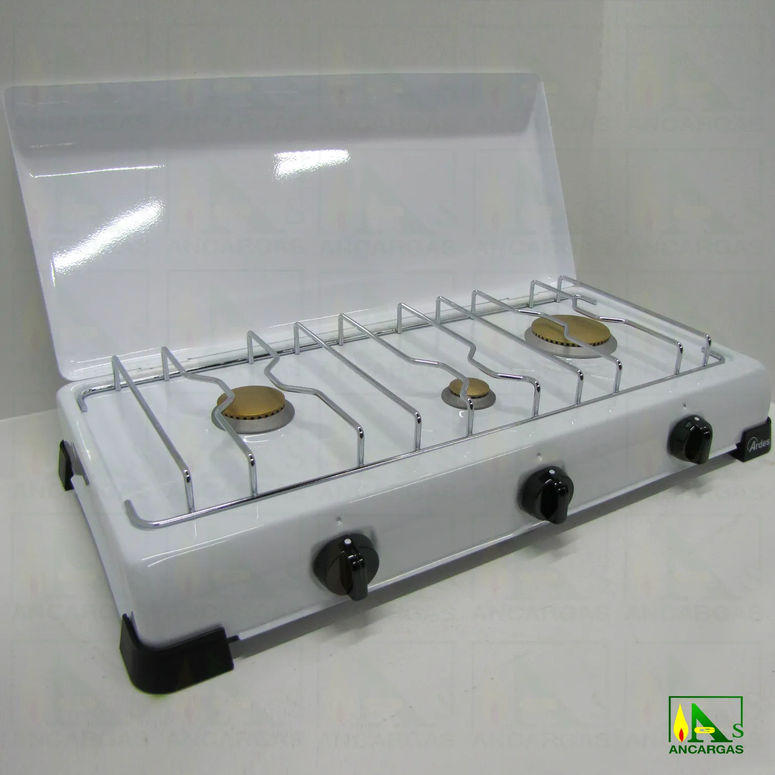 Cocina de gas de 3 fuegos en acero esmaltado blanco con tapa ideal camping
