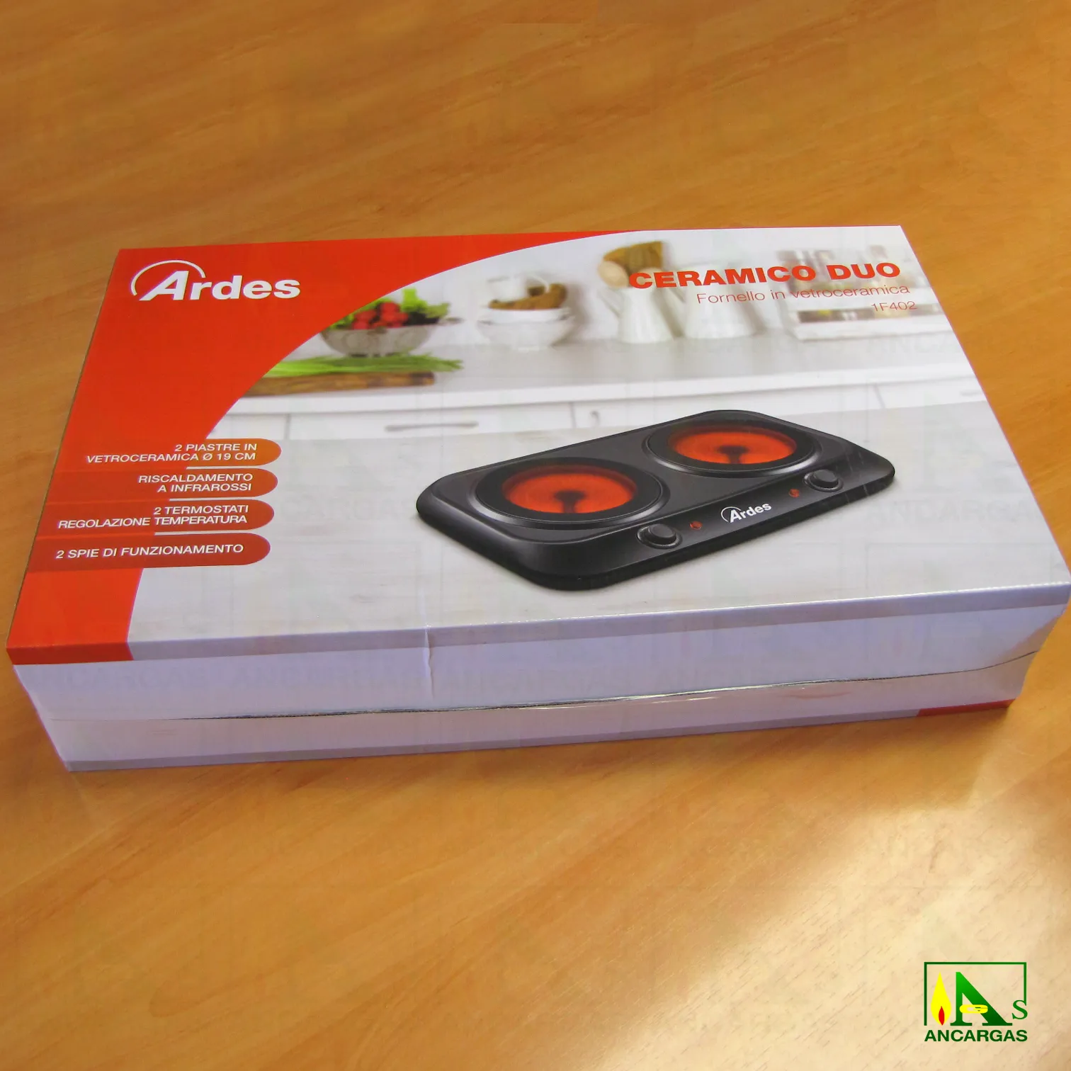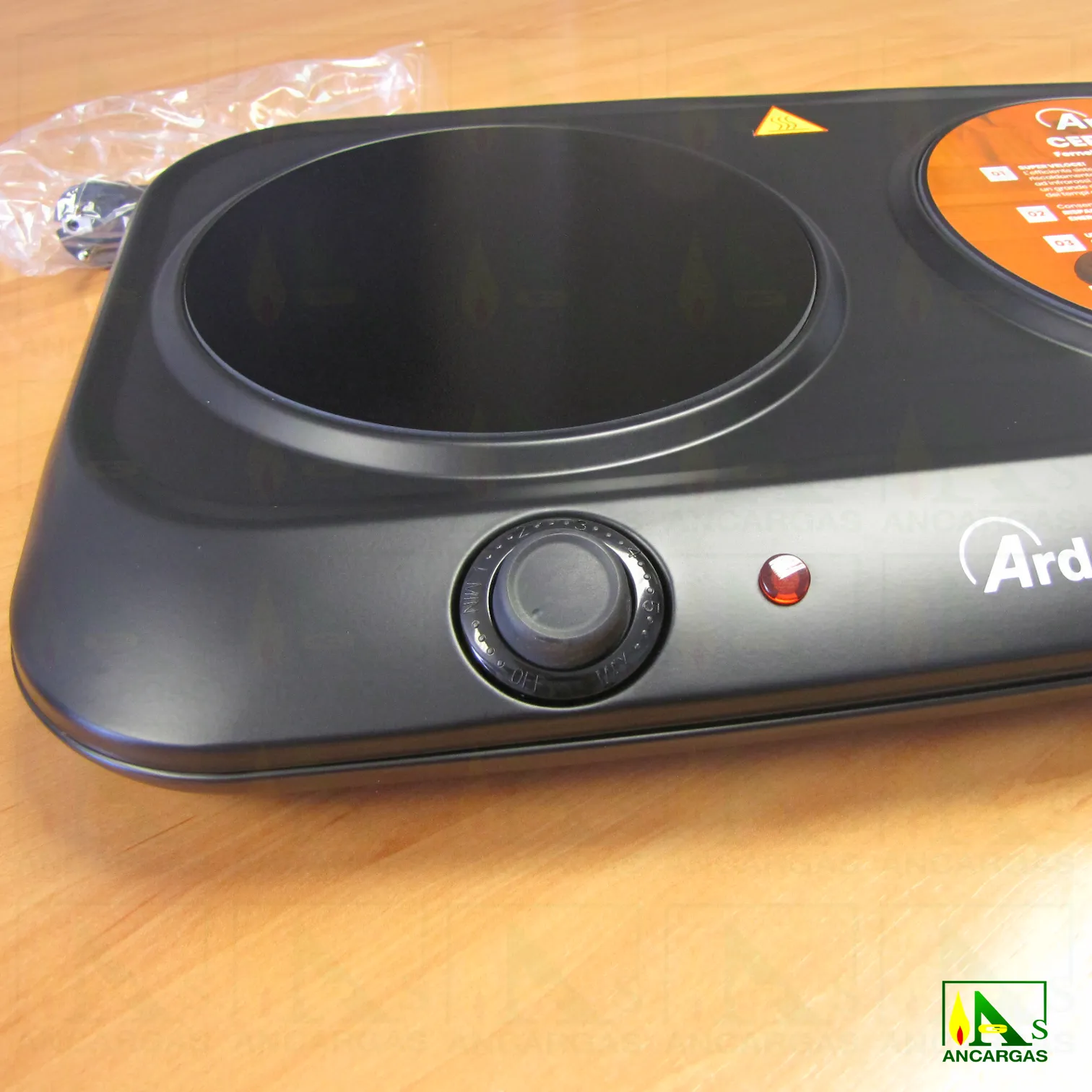 Cocina vitrocerámica radiante con termostato regulable. Potencia máxima 2400W.