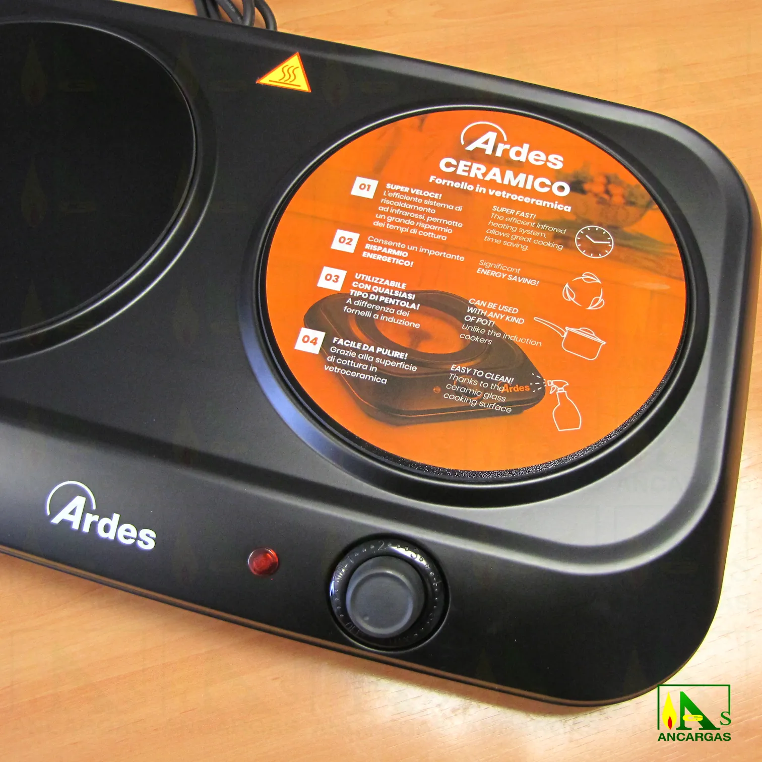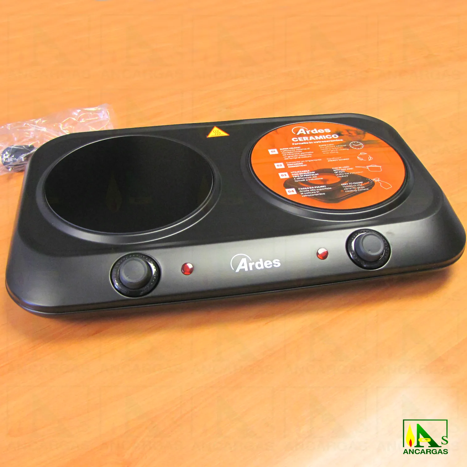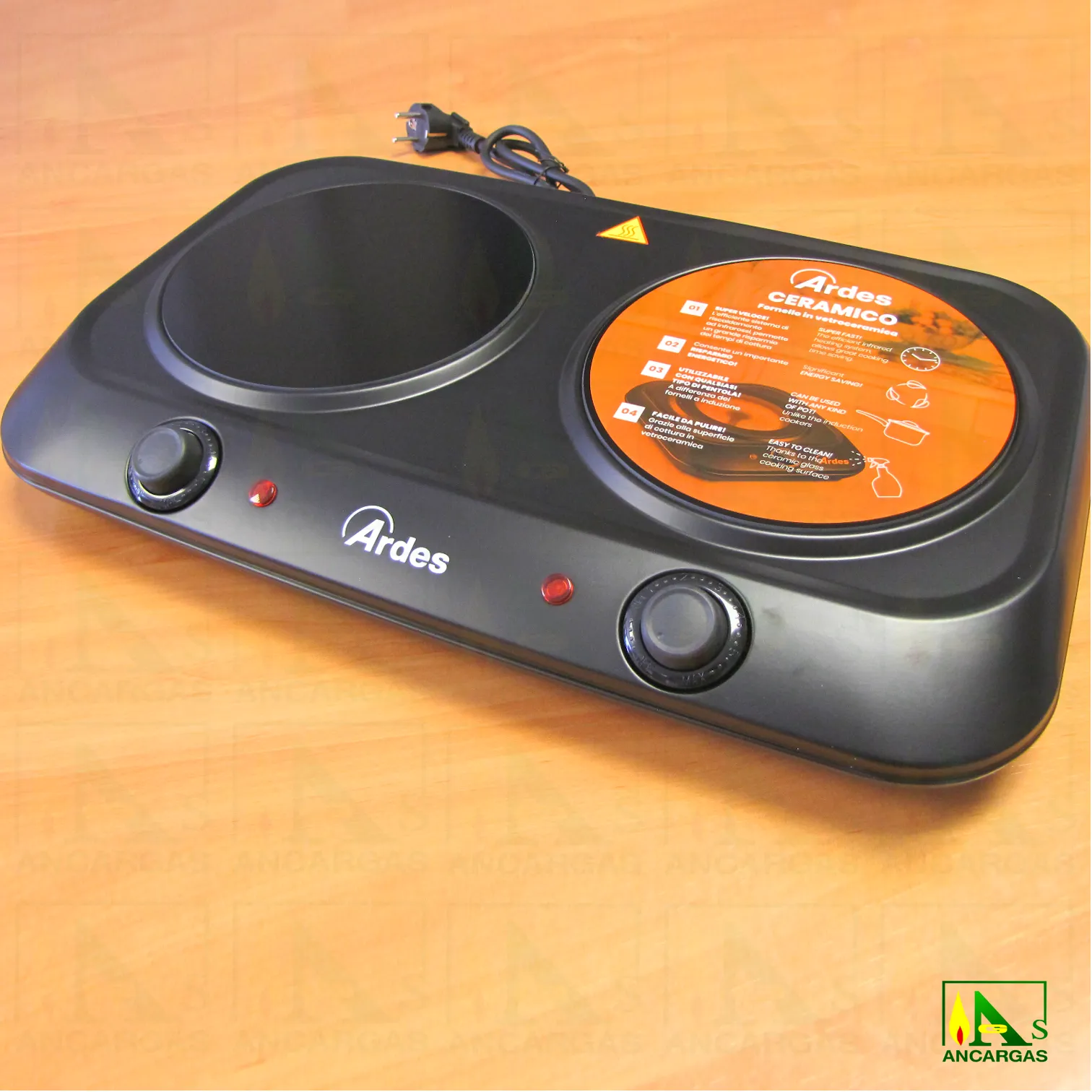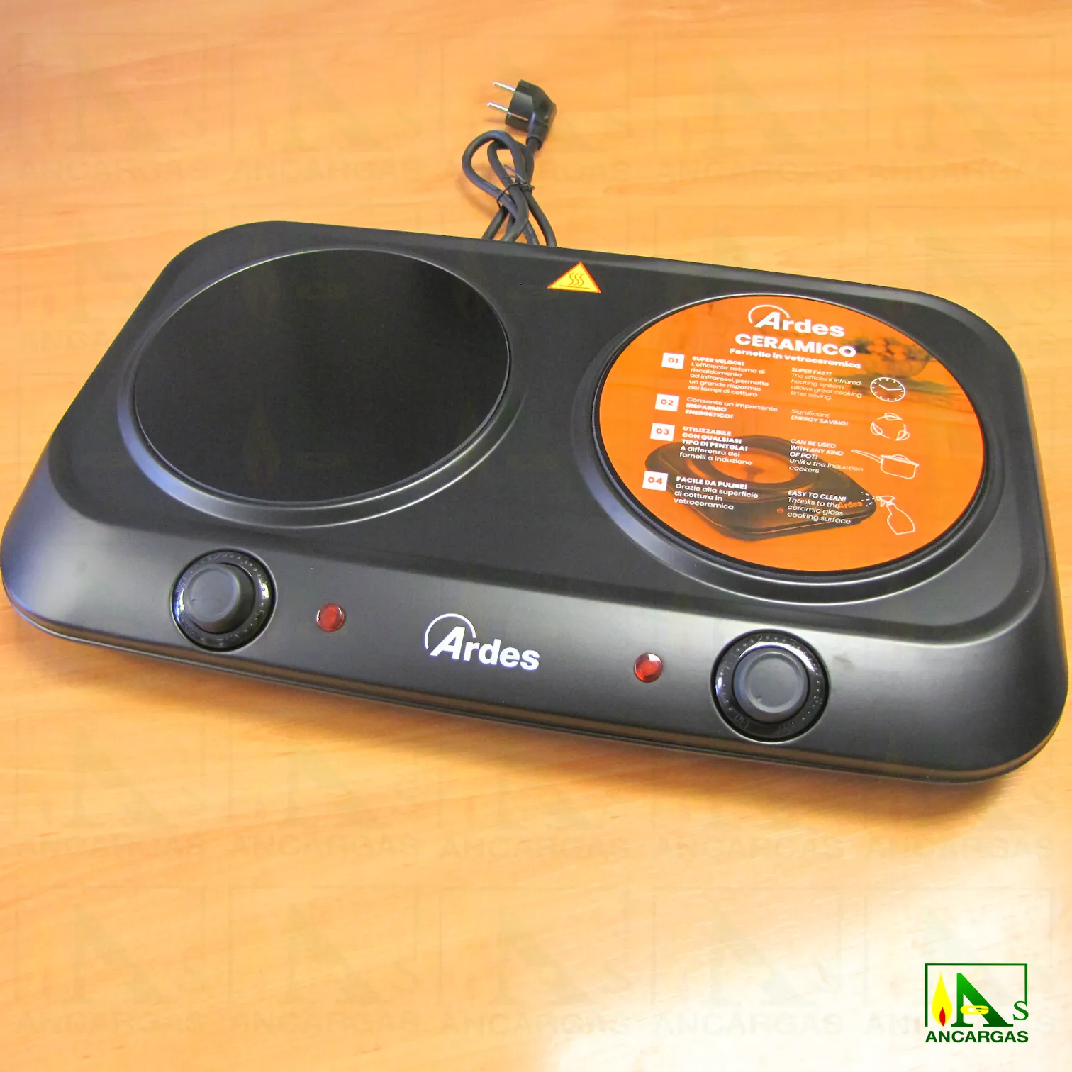 Placa vitrocerámica eléctrica doble con un diseño moderno y elegante, compatible con todo tipo de ollas de metal con fondo plano. Cuerpo en acero esmaltado. Sistema de calefacción por infrarrojos, más eficiente que el gas. Superficie de cocción de cerámica, fácil de limpiar. Equipado con termostatos para regulación de temperatura y pilotos de funcionamiento.