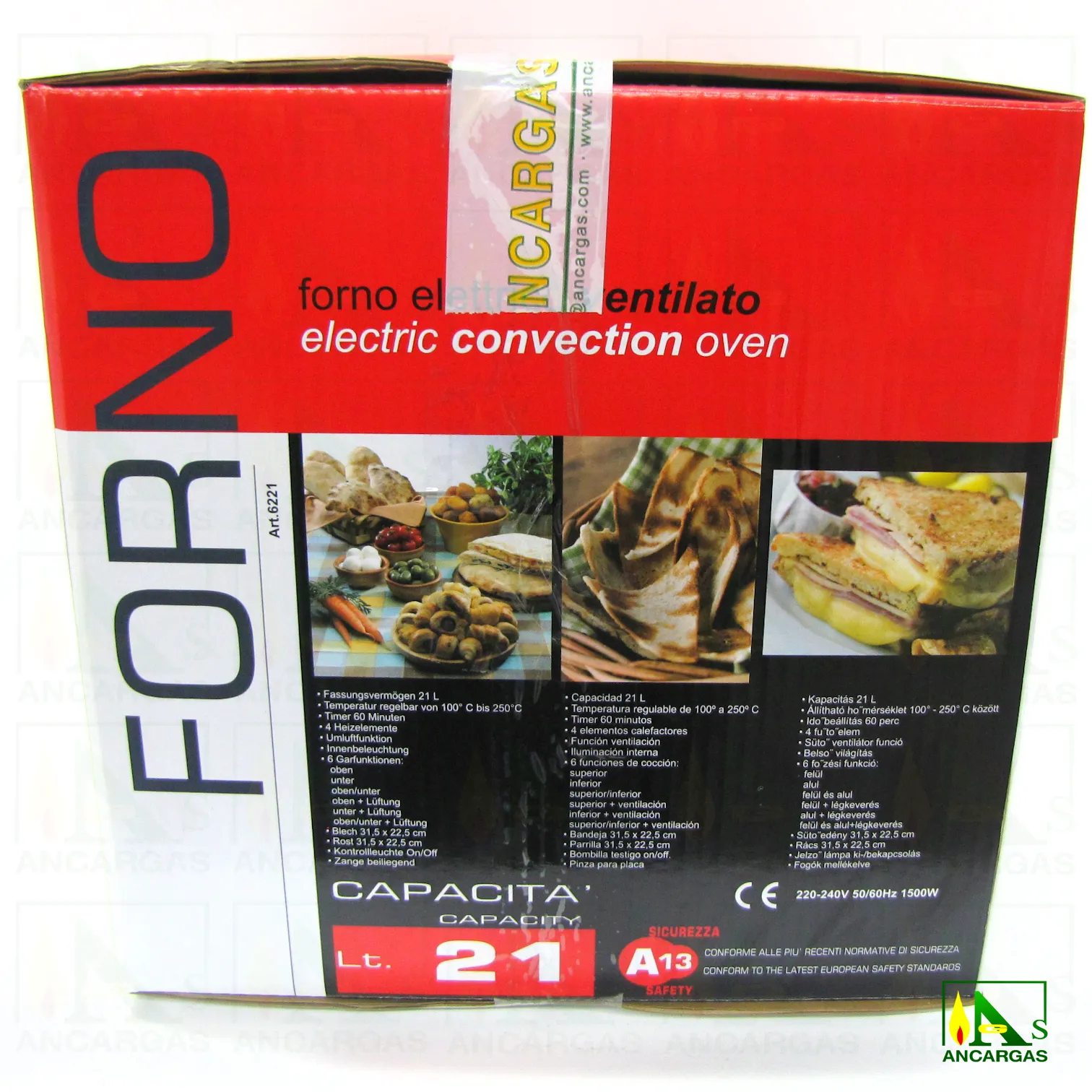 Horno de convección de 21 litros. Estética abombada, acabado en negro.