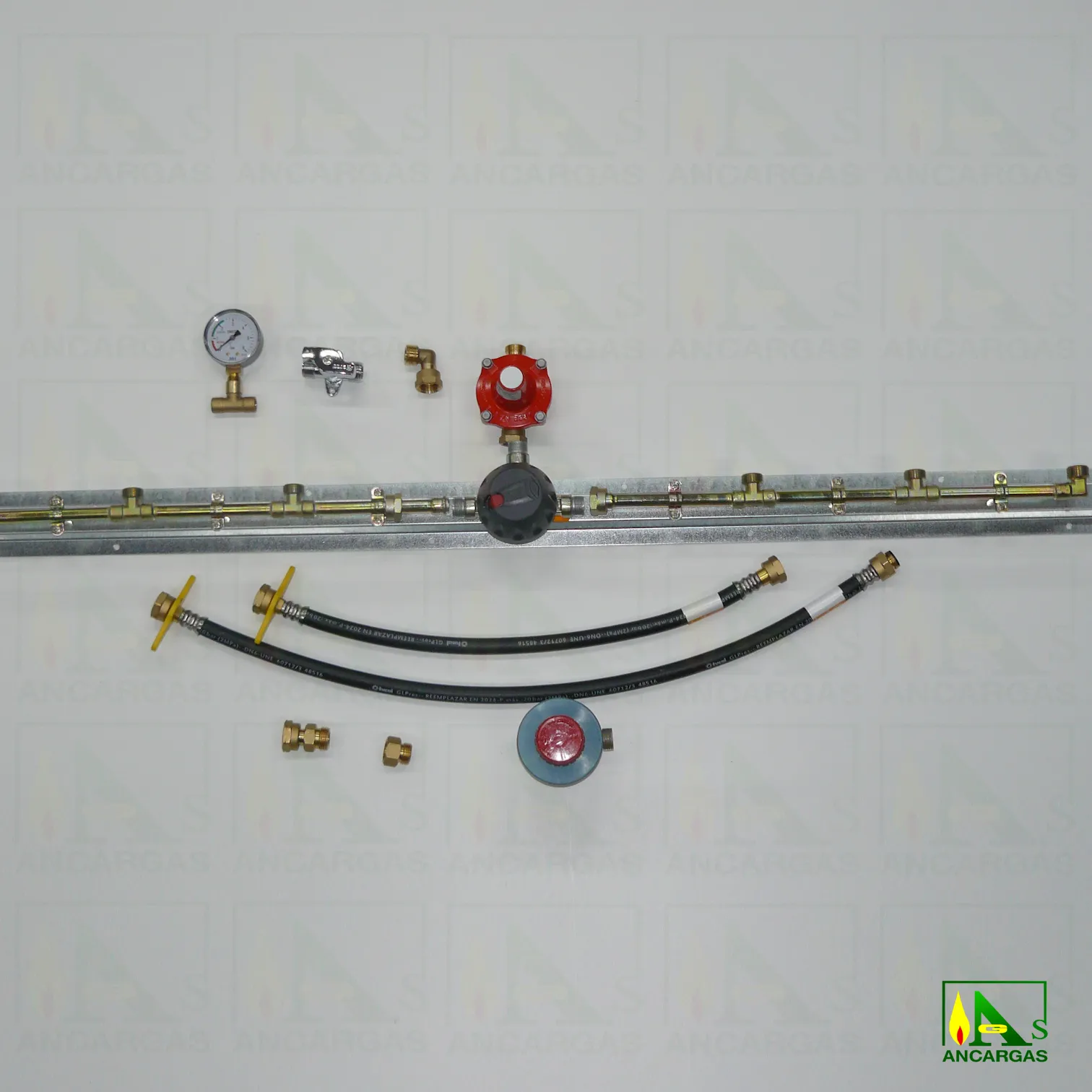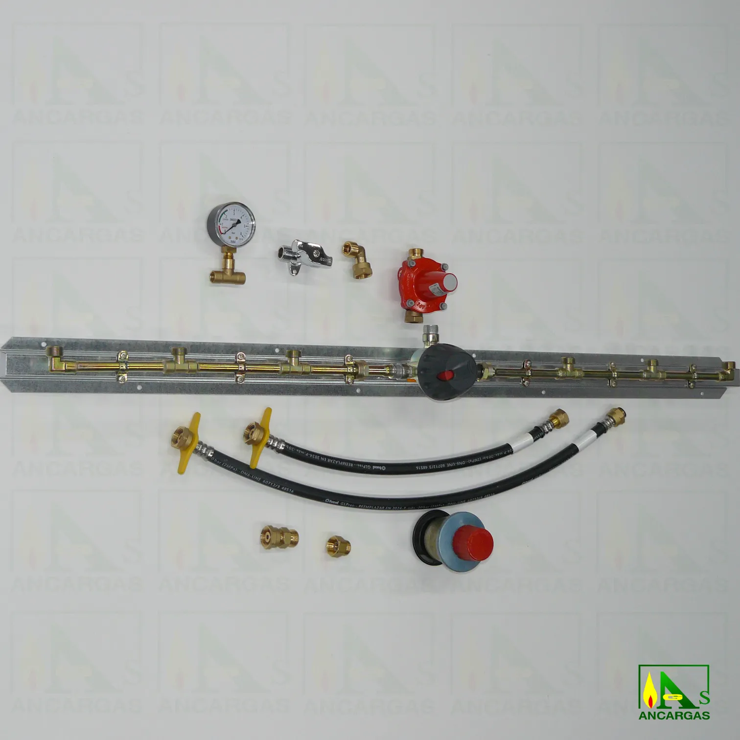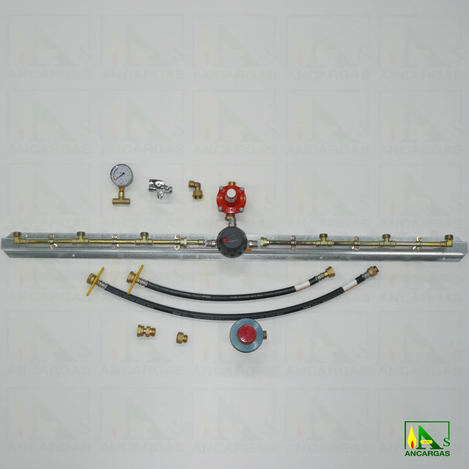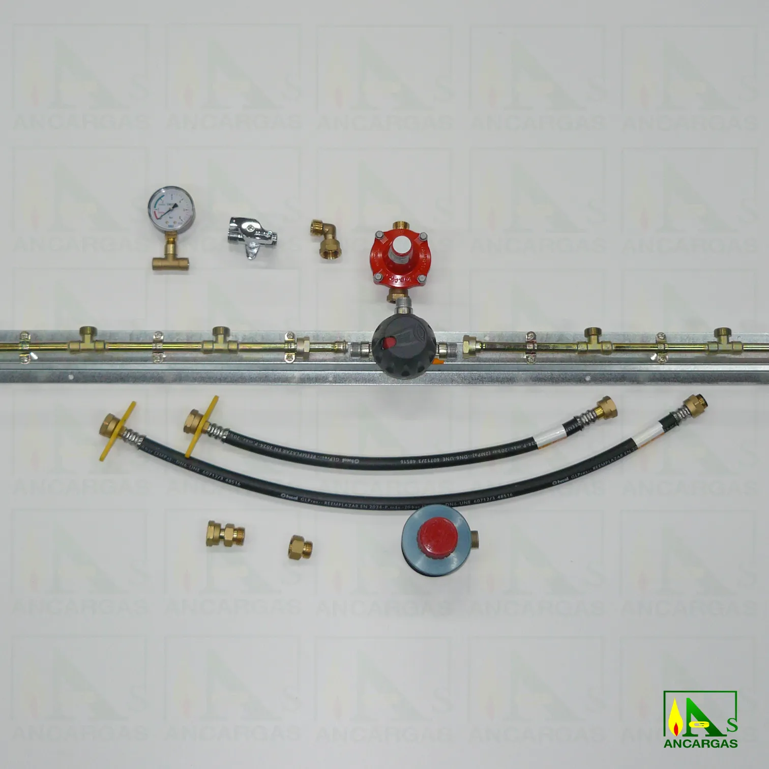 Batería, Reguladores salida libre, Limitadores de caudal, Liras de 50 y 70 cm, Antirretornos, Inversor automático o manual (según modelo), Codo conexión M x T. loca 20×150, Limitador APZ12 a 1,75 bar tuerca loca x macho 20×150, Te portamanómetro 1/4″ soldar a 12, Manómetro indicador servicio-reserva M-1/4″ 0-6 bar, Llave de corte cromada con bloqueo M x M 20×150.