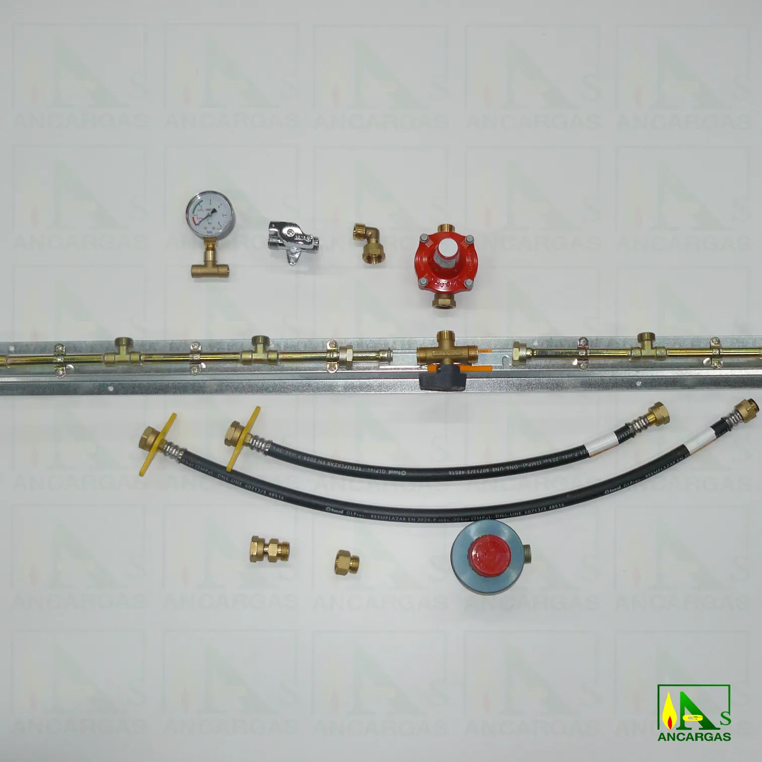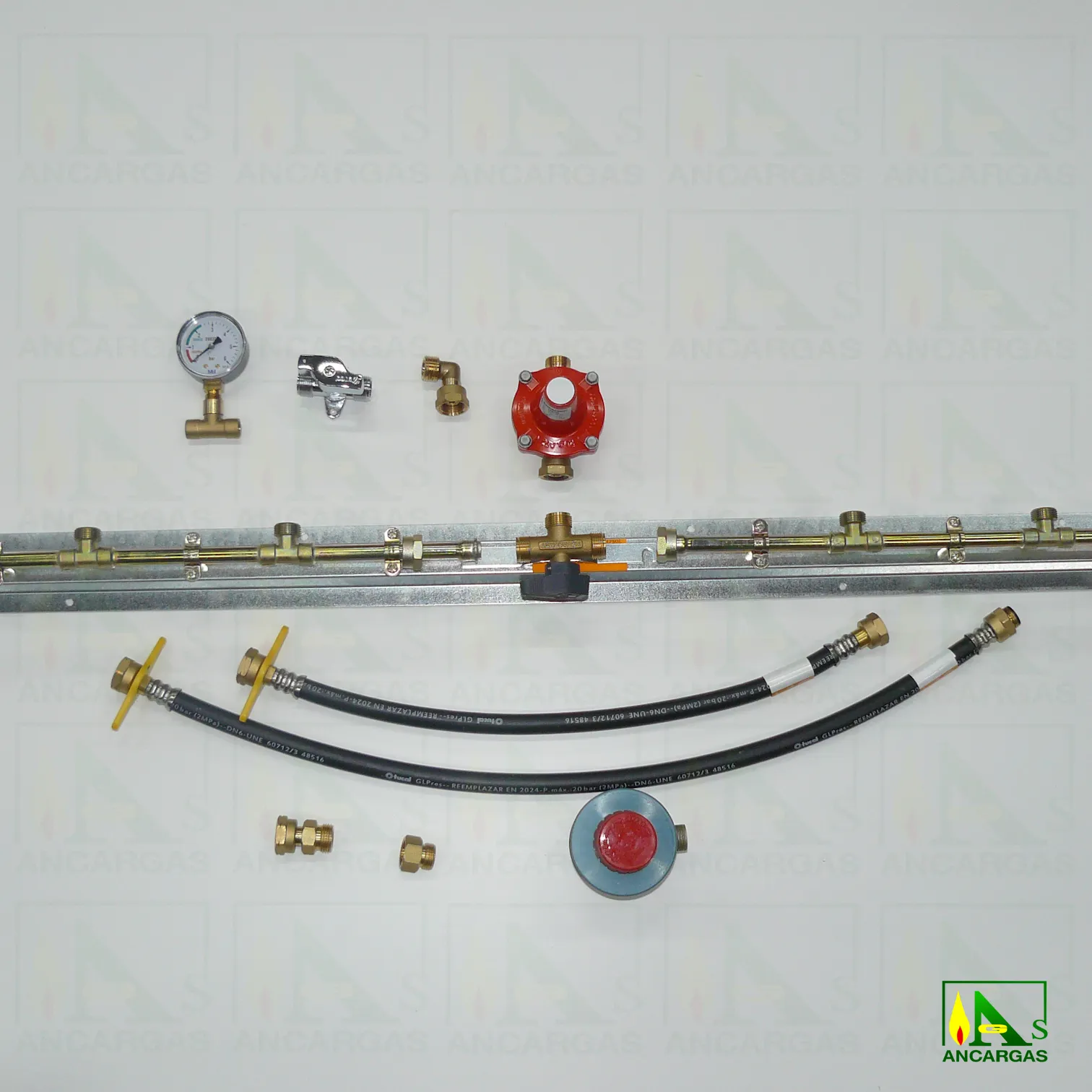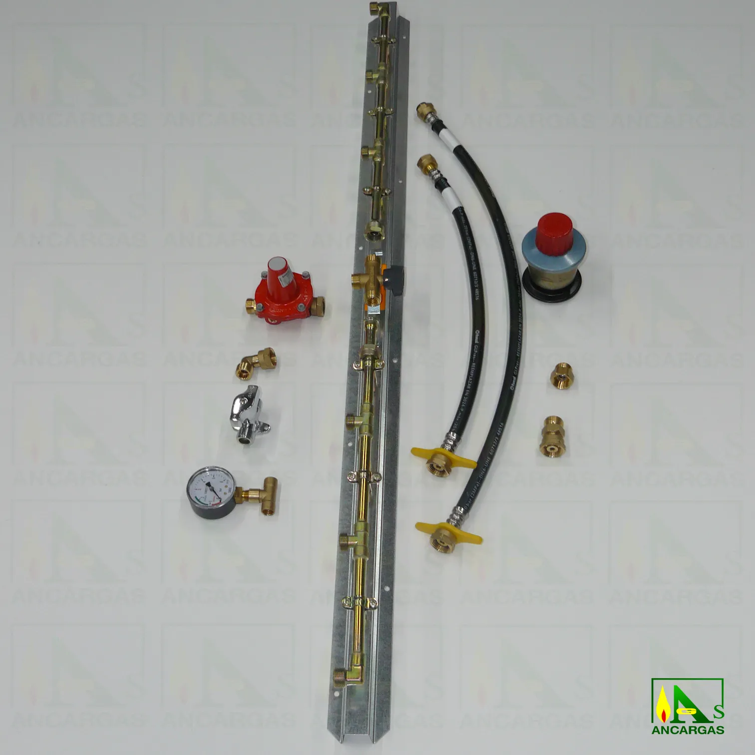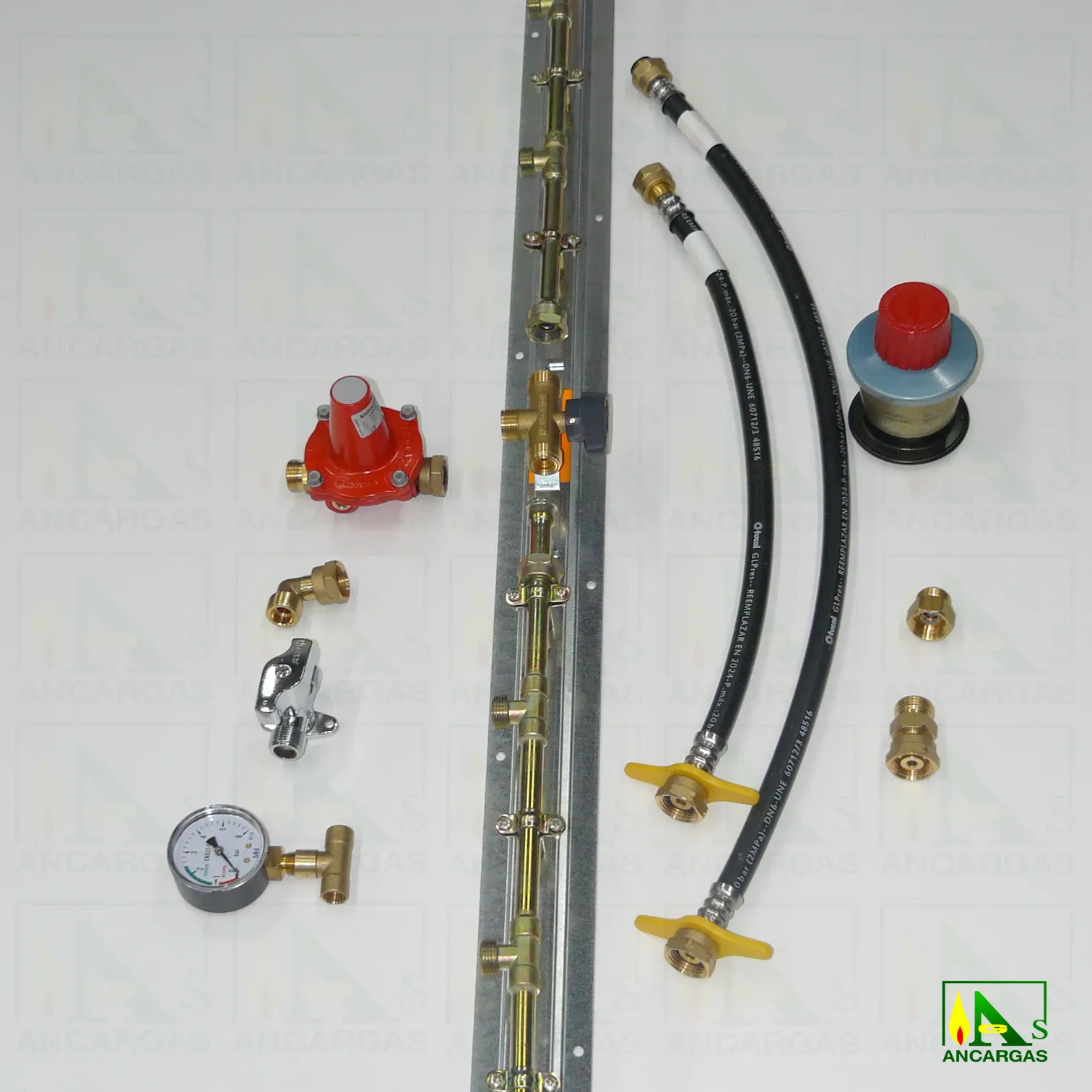 Kits completos de baterías domésticas e industriales para conectar botellas de propano de manera fácil. Embaladas en una caja con todos sus componentes. Compuestos por: