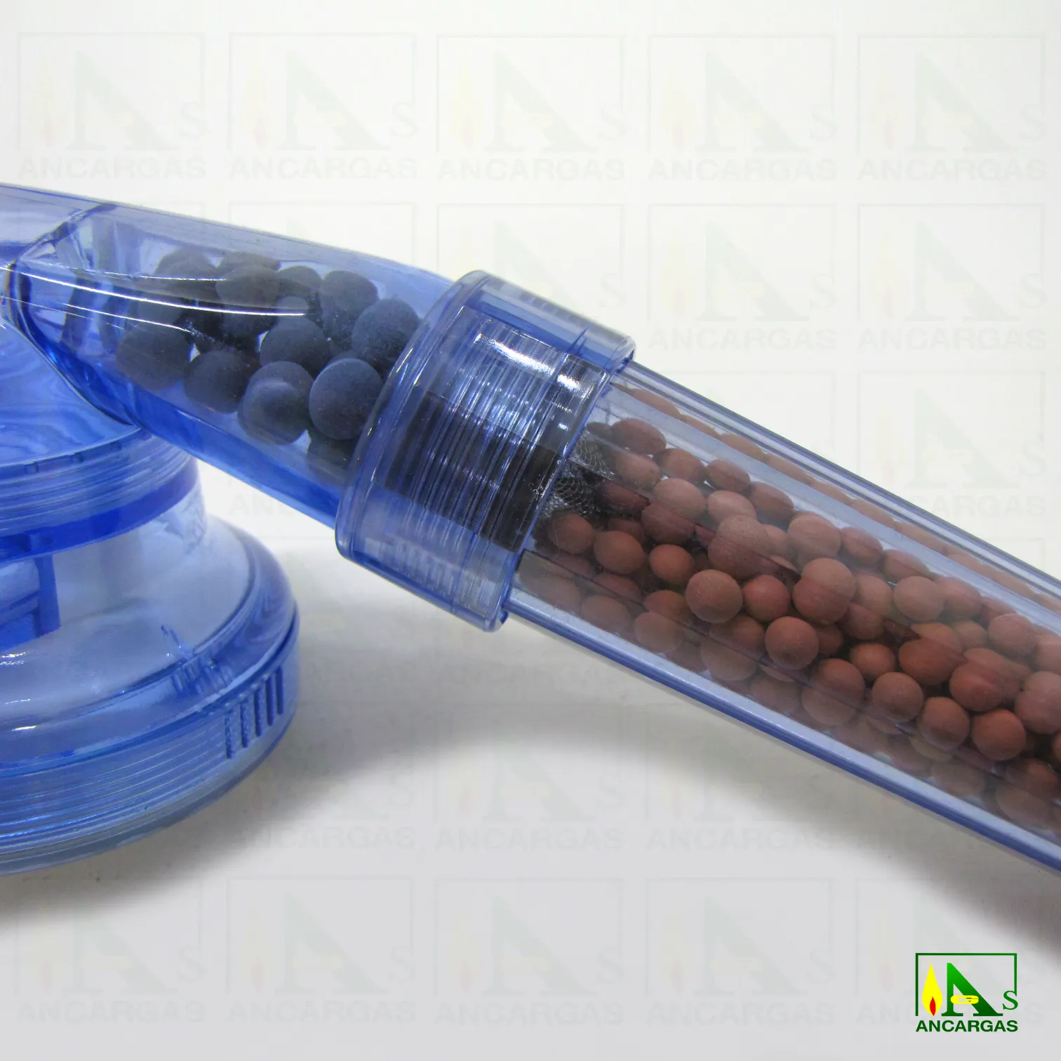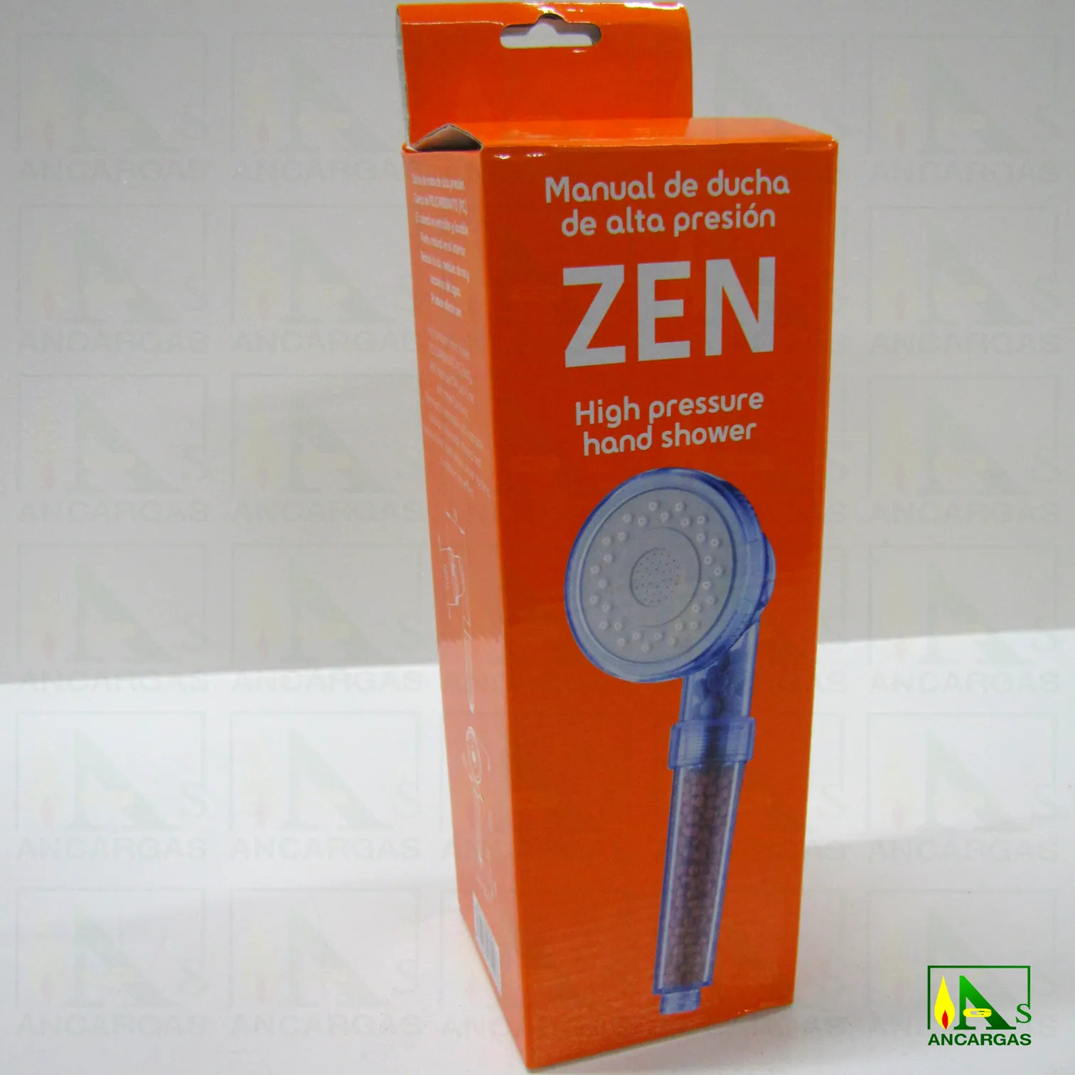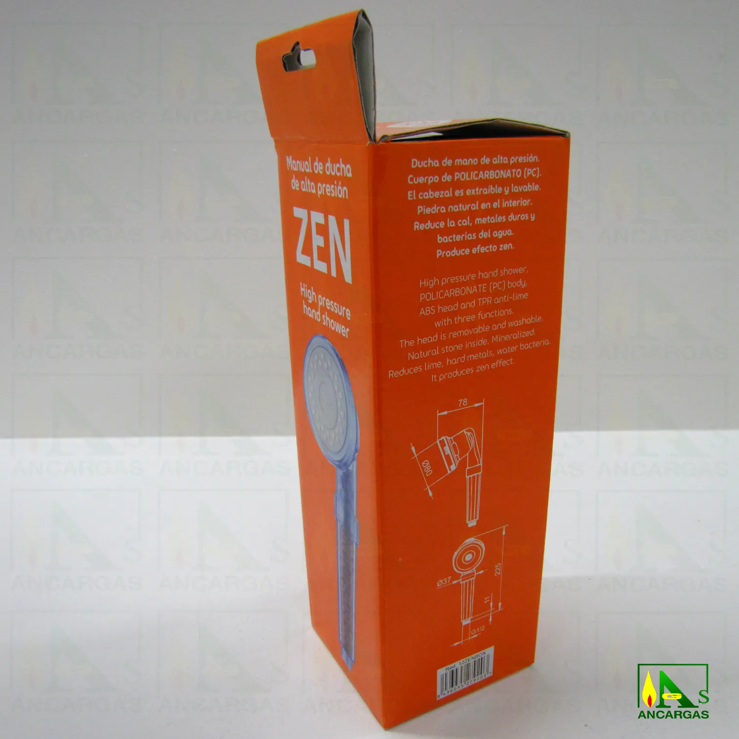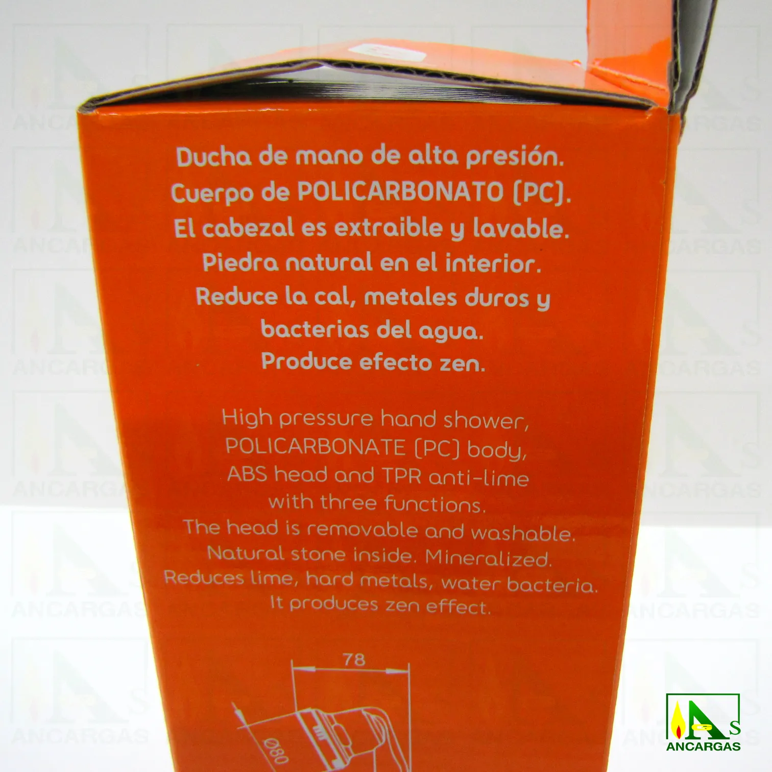 Mango de ducha Zen de 3 posiciones en policarbonato. Ducha de mano de alta presión con cuerpo de policarbonato. El cabezal es extraible y lavable. Piedra natural, reduce cal, metales duros y bacterias del agua para un efecto zen. En caja.