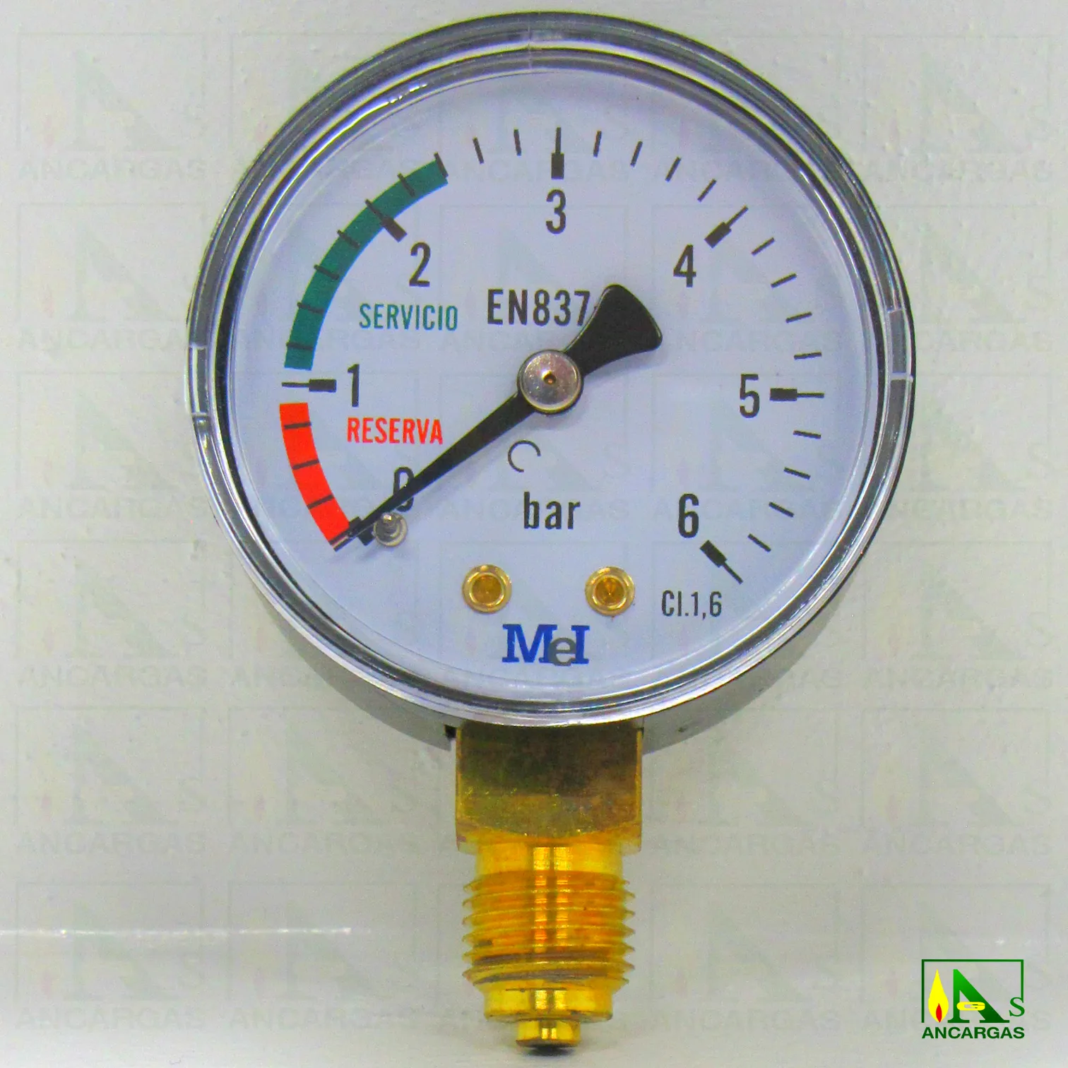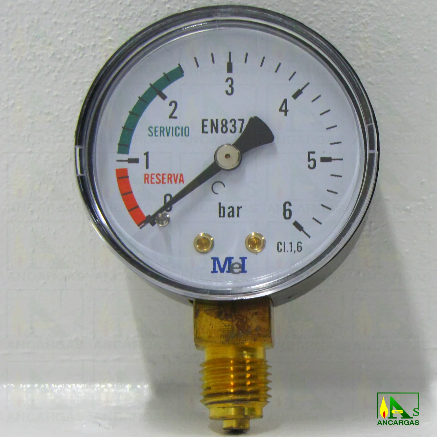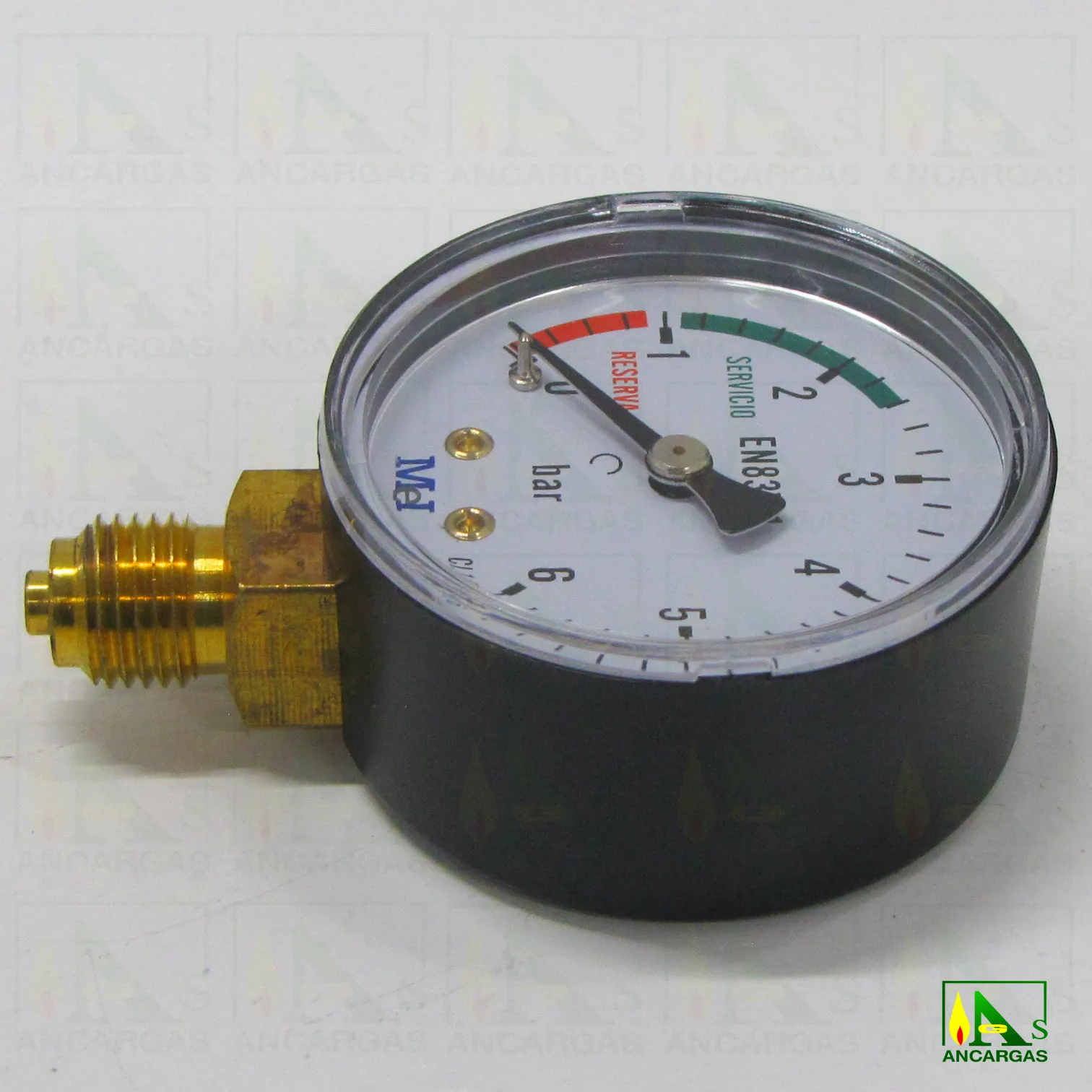 Manómetro de Ø50 seco vertical 1/4″ gas, caja abs. 0-6 bar, reserva-servicio. Se utilizan para comprobar los depósitos de GLP que hay en las casas de fin de semana o casas fuera de la ciudad, cuando está en rojo hay que pedir la recarga.