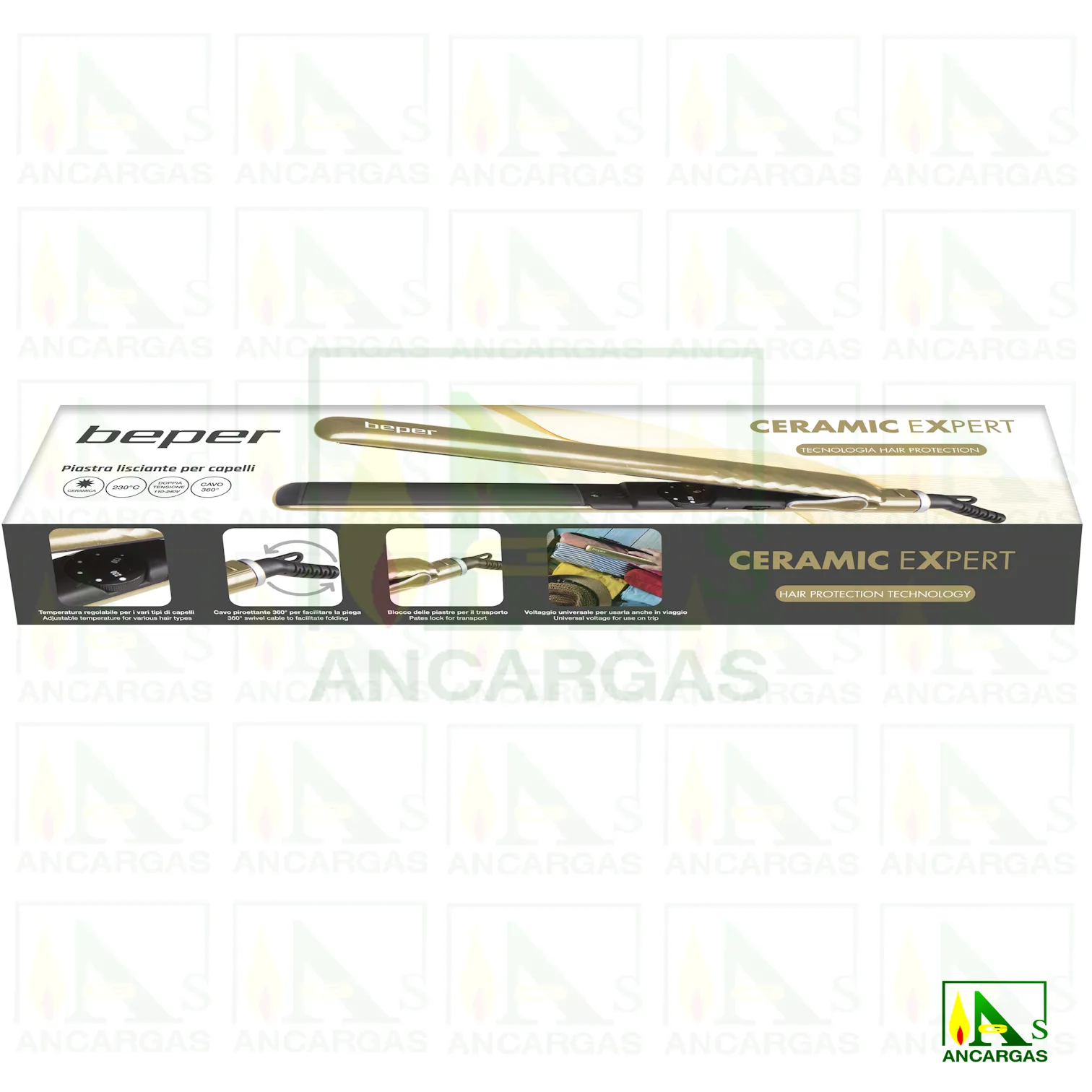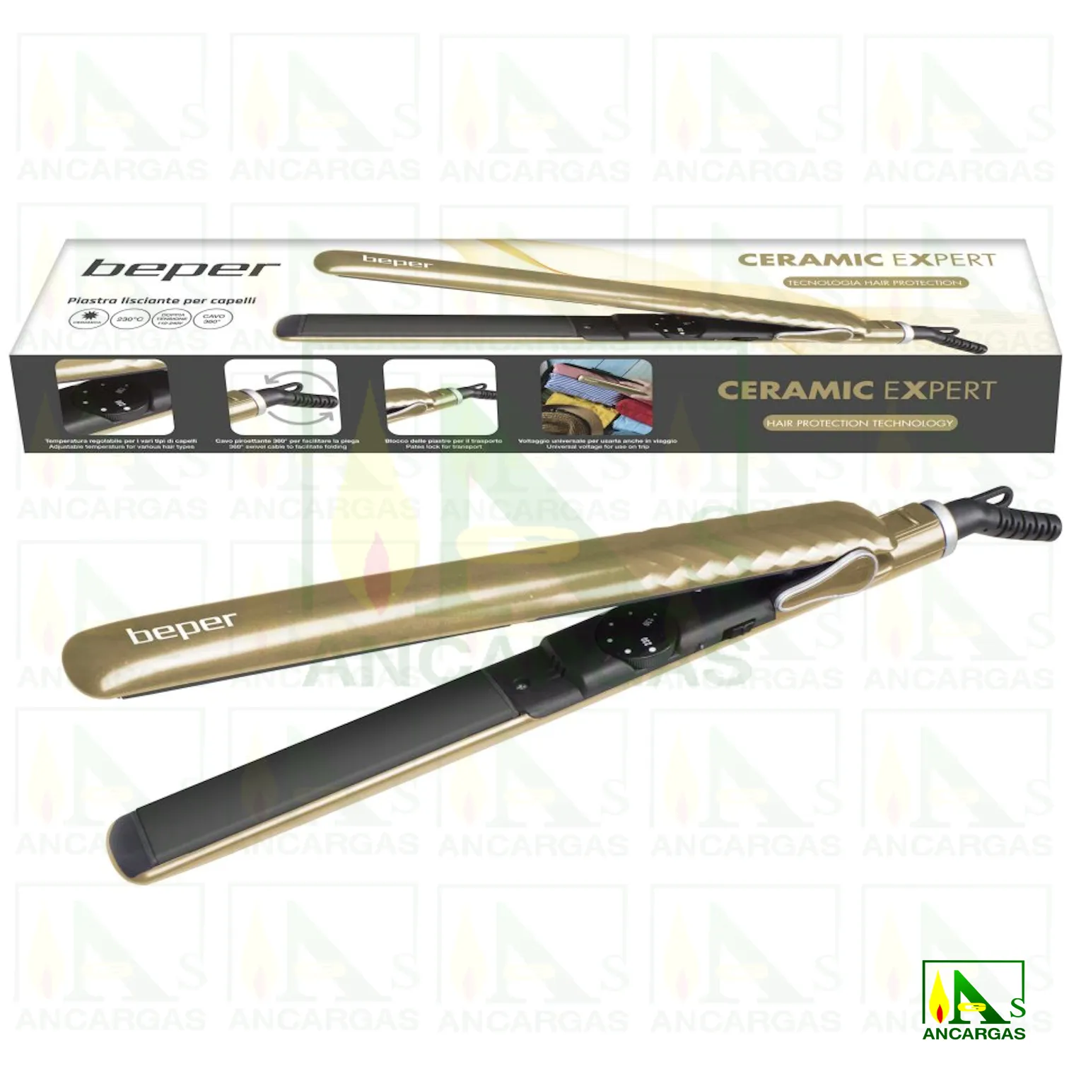 Plancha para el pelo con revestimiento de cerámica equipada con una rueda para ajustar la temperatura de 130°C a 230°C. Con un cable giratorio de 360°, un cómodo gancho para colgar y un gancho para bloquear las placas para una fácil portabilidad.