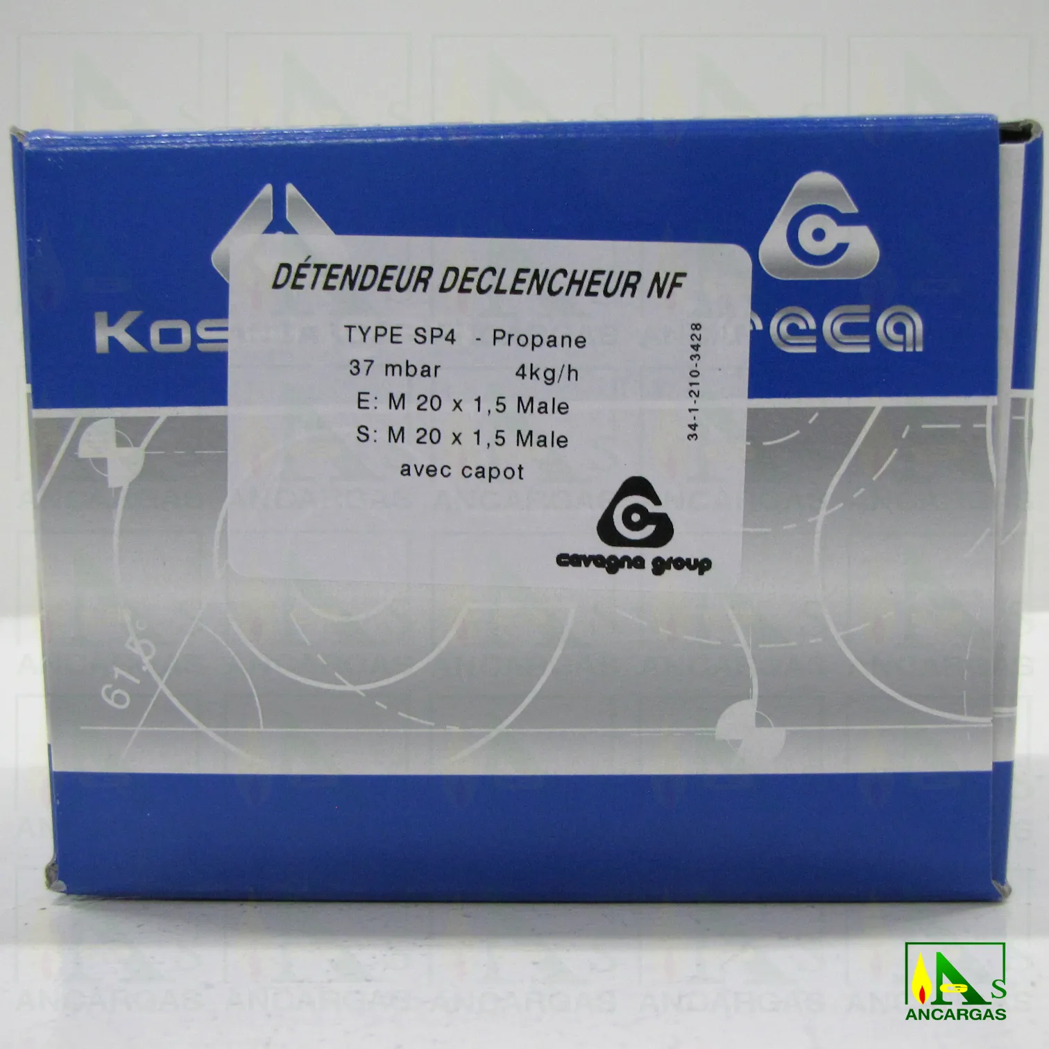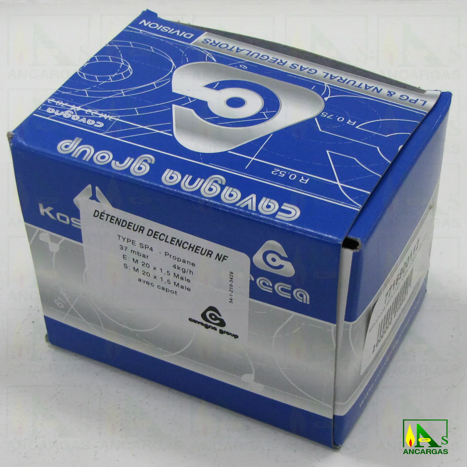 Regulador Reca 4 kg/h 37 mbar con VIS MIN de rearme manual y capota MxM 20×150