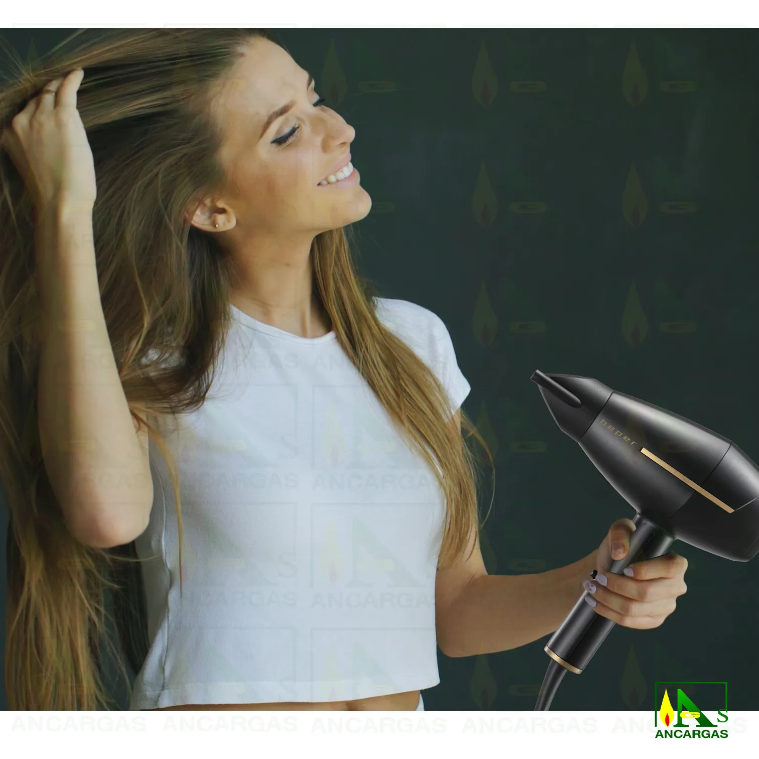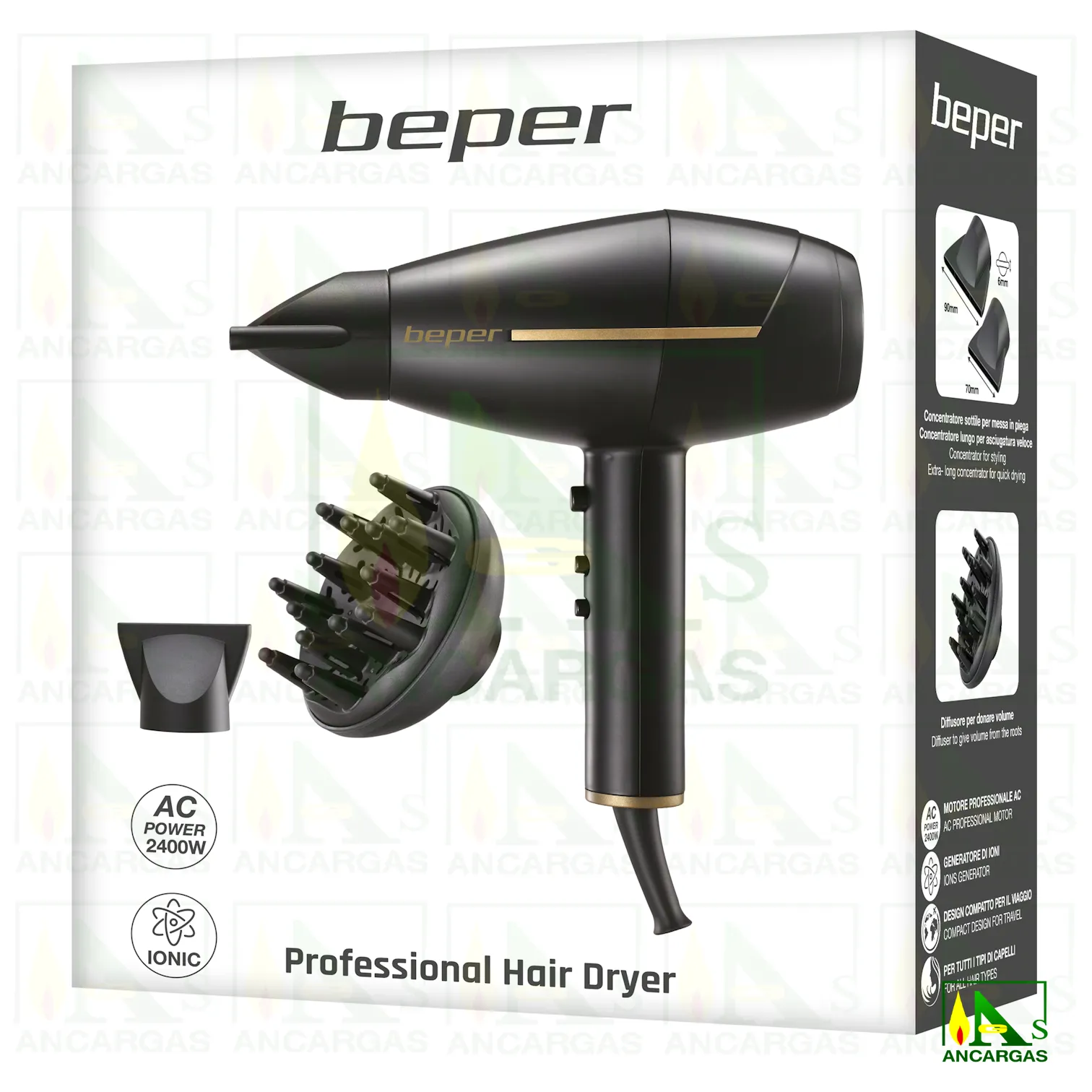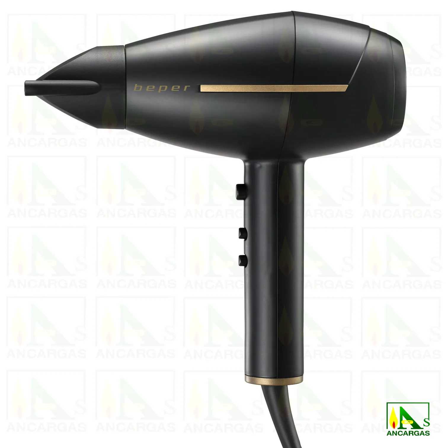 Secador de pelo profesional con motor de AC con diseño compacto y moderno. Dos velocidades seleccionables diferentes, tres niveles de temperatura y botón de soplado de aire frío. Con función iónica para un cabello más brillante sin electricidad estática. Equipado con dos concentradores de aire de 9 y 7 mm y un difusor. Con protección contra sobrecalentamiento y rejilla trasera extraíble.