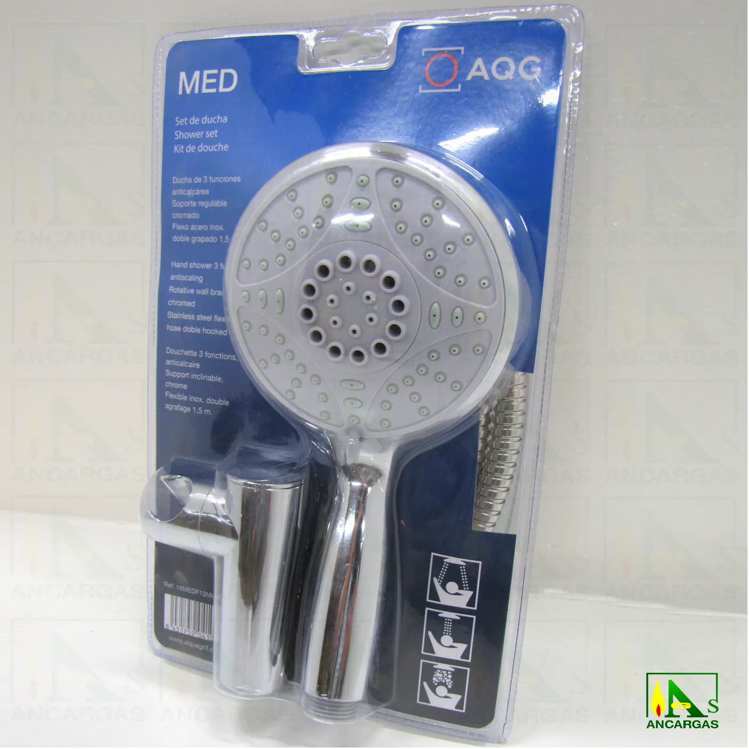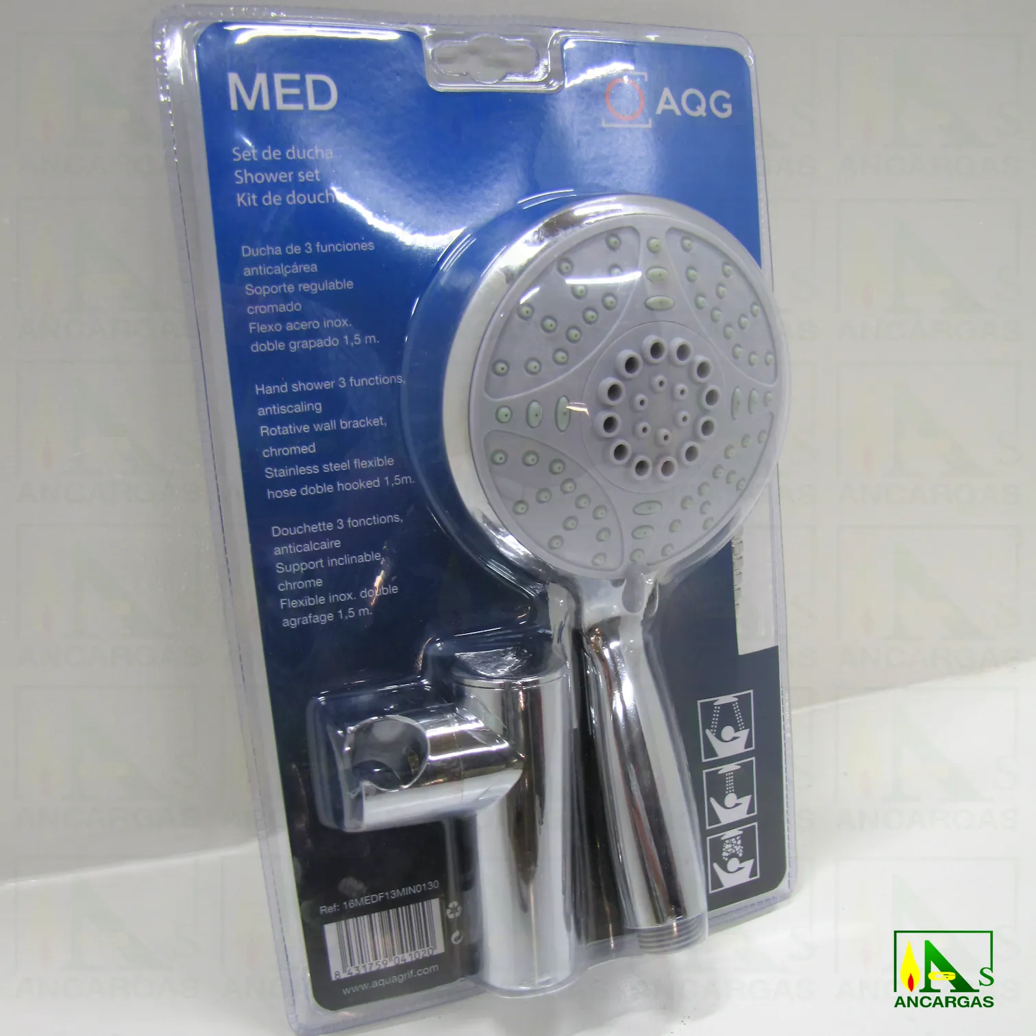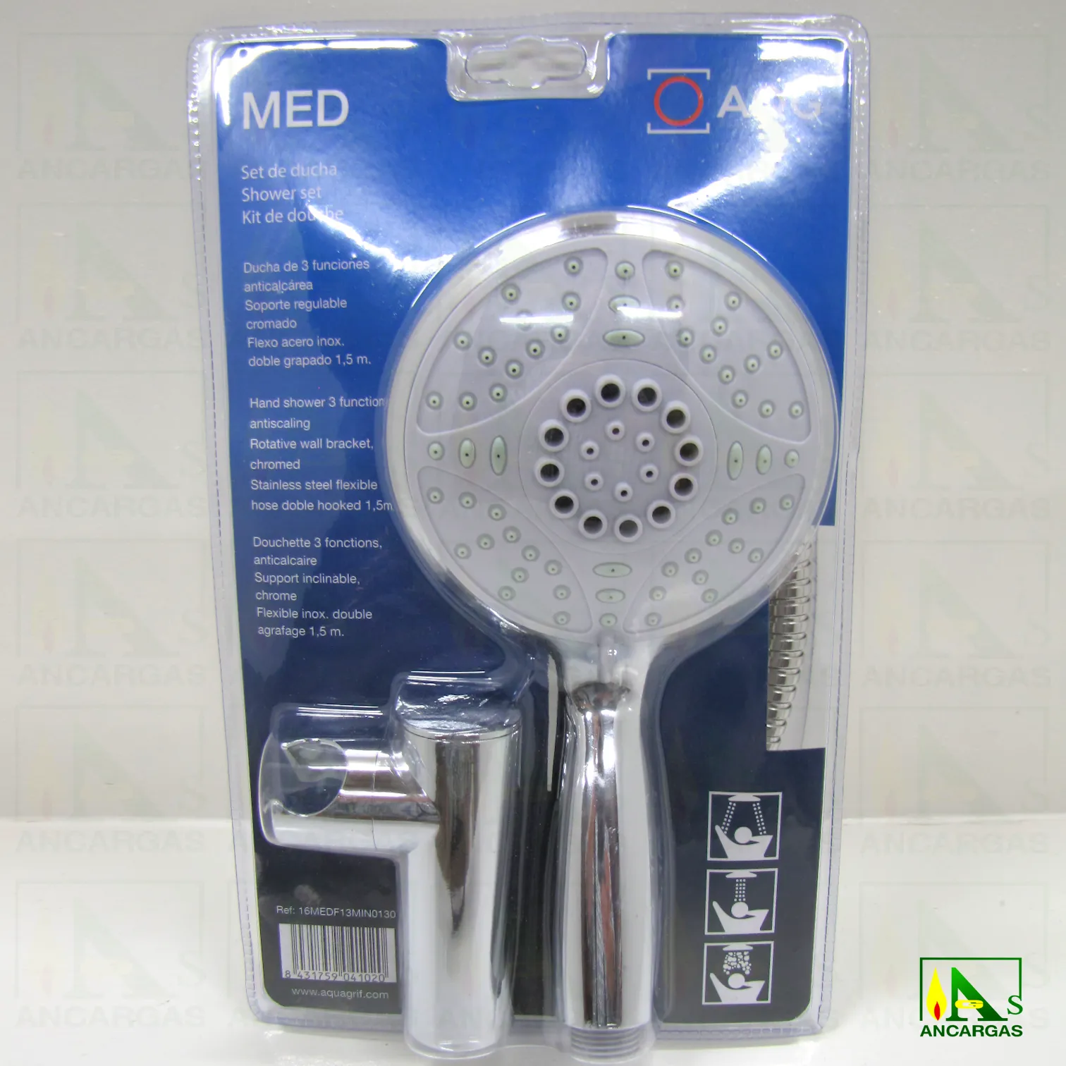 Set de ducha anticalcárea Modelo MED: 3 funciones, soporte pared regulable y flexo
