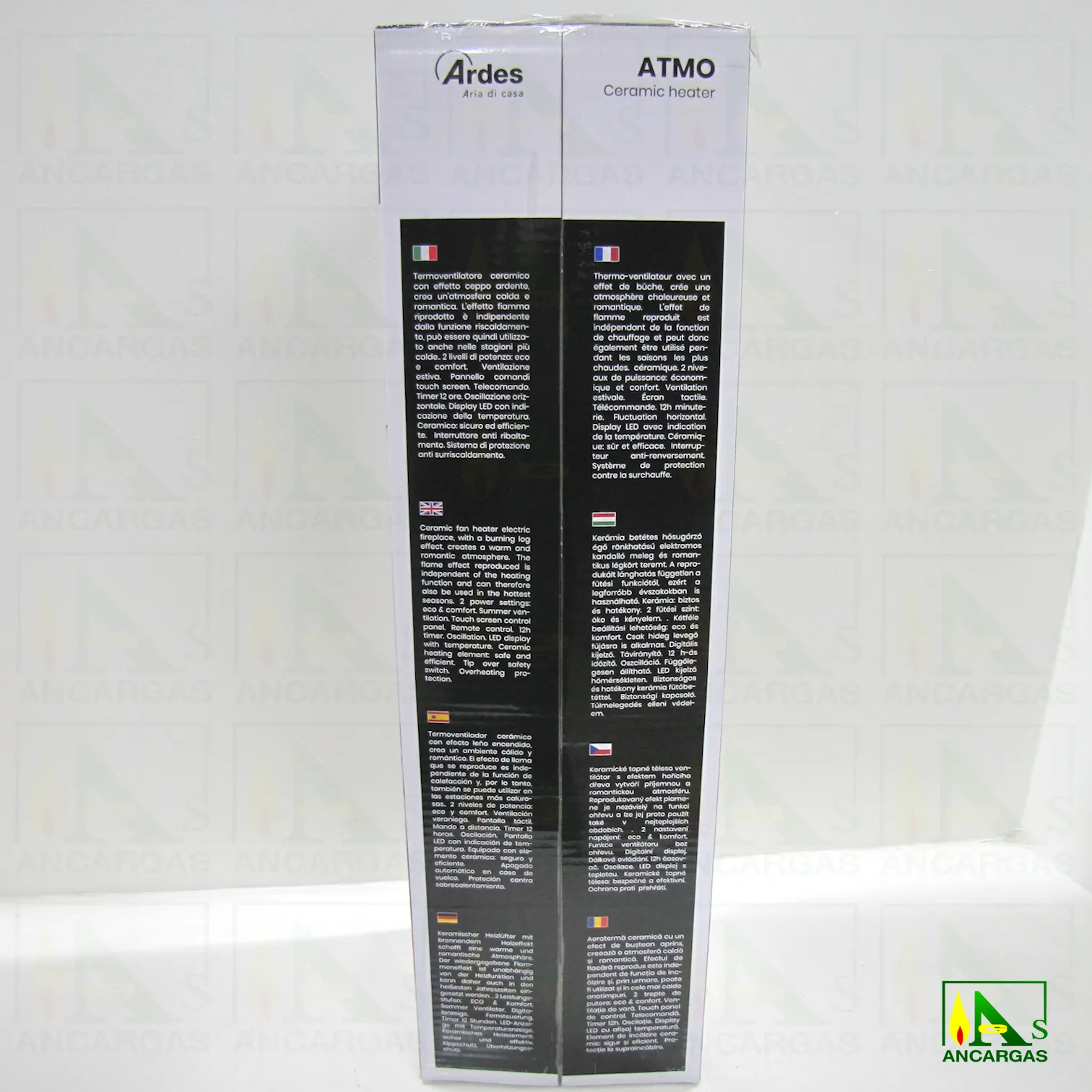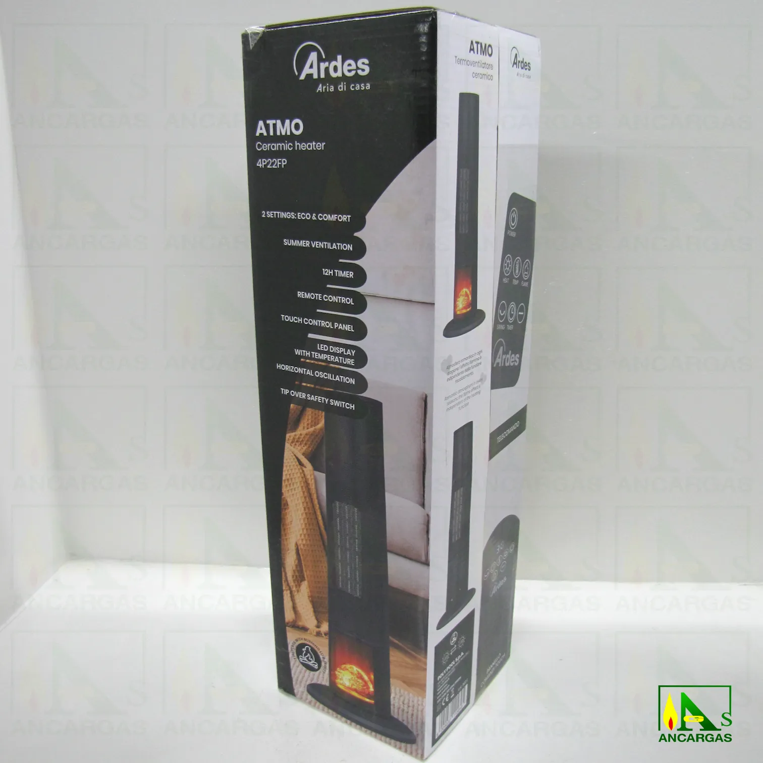 Calefactor cerámico. 2 niveles de potencia: eco y confort (1400 y 2000W) . Panel de control táctil. Control remoto. Temporizador de 12 horas. Oscilación horizontal. Cerámica: segura y eficiente. Efecto brasas / llamas, crea un ambiente cálido y romántico. Interruptor antivuelco. Sistema de protección anti sobrecalentamiento. Potencia 2000W.
